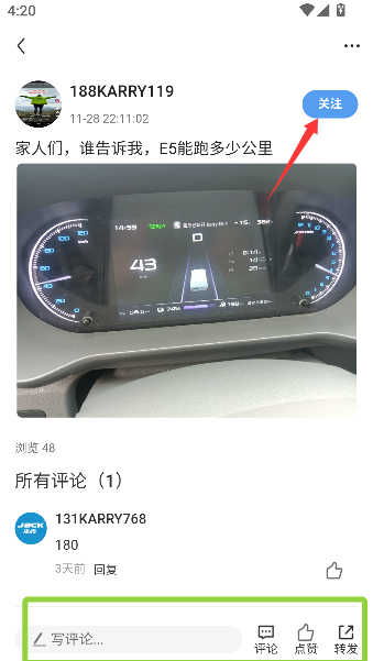 3、觉得对味就“关注”楼主,像在车队里结识同好,用“点赞”点亮示廓灯,用“评论”友好鸣笛,一键“分享”到更广的车道。