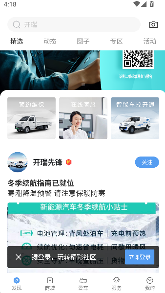 《开瑞汽车》是一款服务于车辆管理与互联出行的综合型应用程序。软件核心围绕车辆状态监控、远程控制操作、车联网服务与车辆信息服务展开。状态监控模块实时显示车辆位置、油量续航、胎压数据、里程信息及故障报警状态。远程控制支持车门锁、车窗、空调的远程操控,以及发动机启动、寻车等便捷功能。车联网服务涵盖在线导航、路况信息、电子围栏设定与违章信息查询。