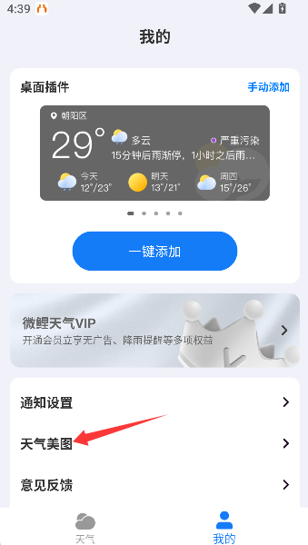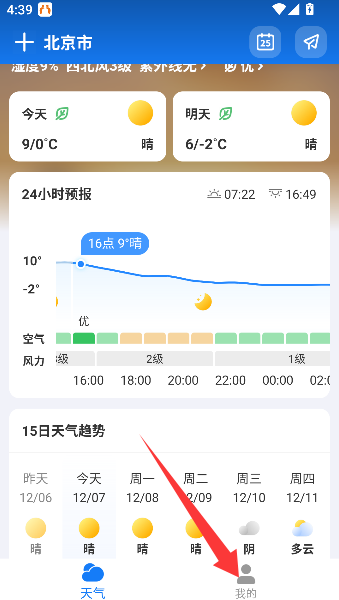 1、打开“我的”入口,宛如开启个人天气藏宝室的门户,其中收纳了所有气象相关的设置与珍藏。