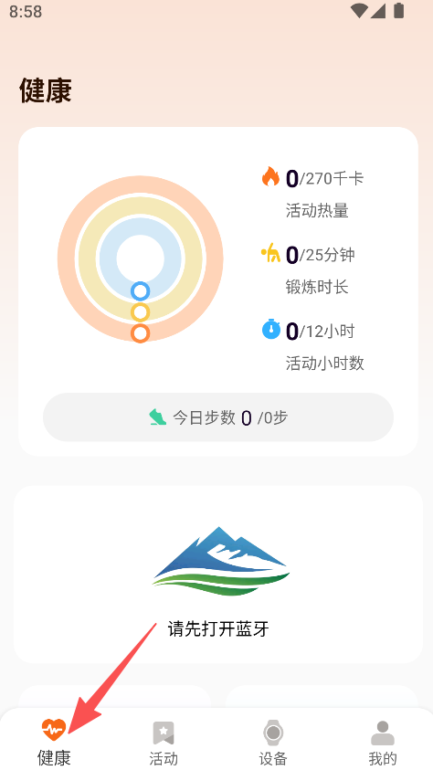 1、打开《山威运动健康》,进入健康页面,准备进行操作。