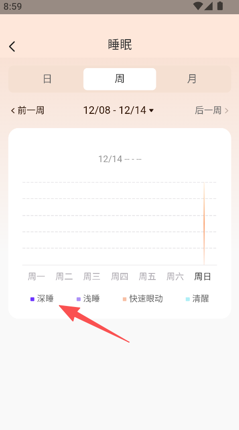3、在睡眠页面选择日、周、月维度,查看对应的睡眠状态数据。