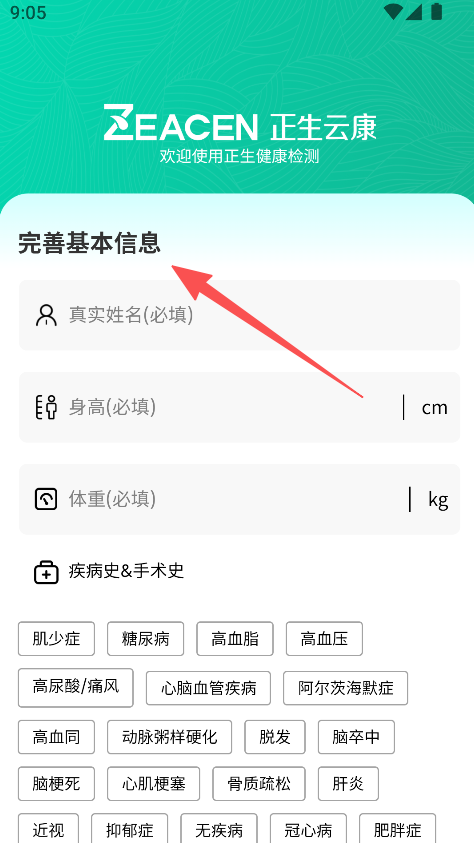 1、提供完善基本信息的功能,支持填写真实姓名身高体重等必填内容,也可补充疾病史与手术史信息。