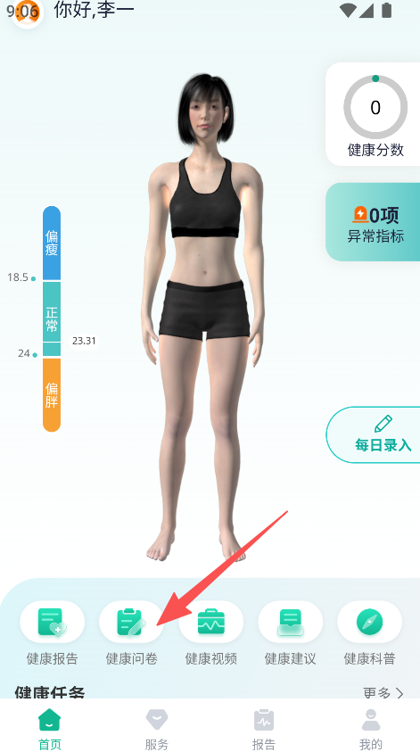 2、进入软件首页,找到健康问卷板块,点击进入问卷页面。