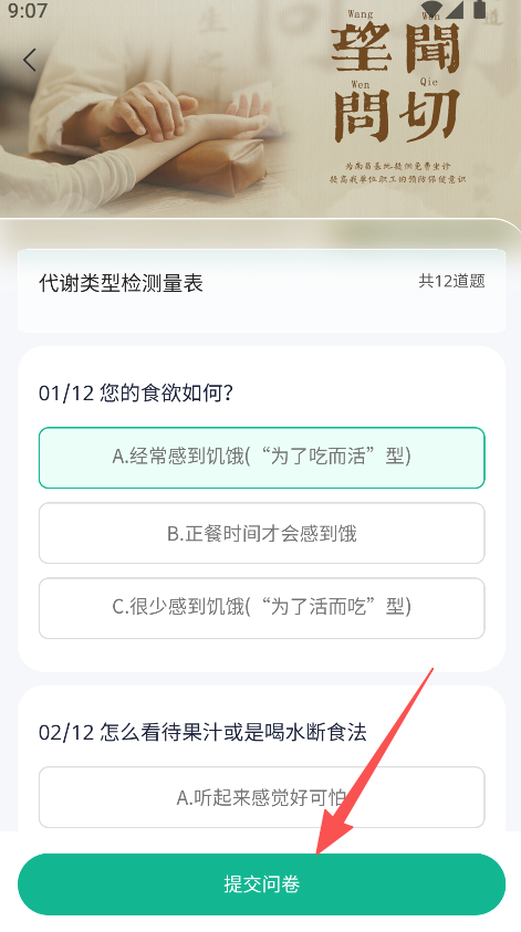 2、设有健康问卷功能,包含代谢类型检测等量表,可完成题目选择并点击提交问卷的操作。