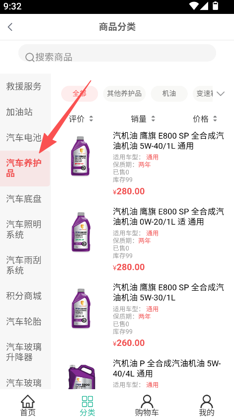 2、设有商品分类功能,可进入分类页选择汽车养护品等品类,查看对应商品的详细信息。