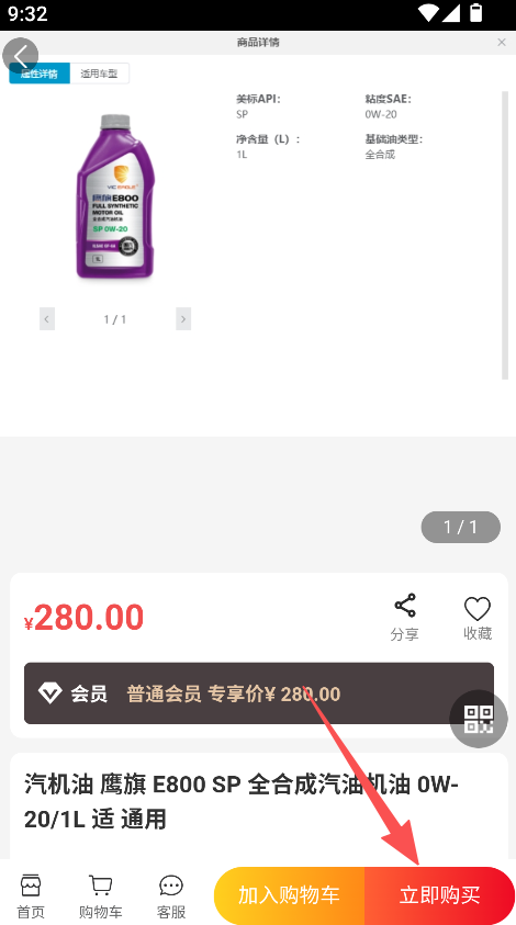 《诚达车服》是一款车主服务类软件,支持添加爱车以获取专属福利,含车型专属保养、车况监测等服务,设有预购、活动套餐、加油站等功能模块,可进入分类页选择汽车养护品等商品,查看详情后进行加入购物车或立即购买操作,助力车主便捷完成车辆相关用品采购与服务获取。