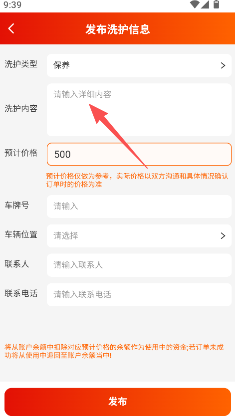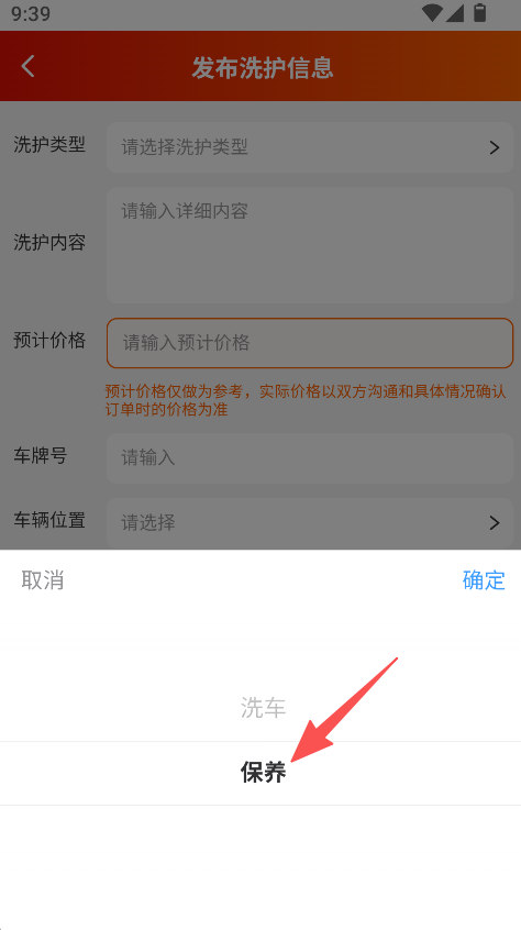 3、发布洗护信息需填写多维度内容,包含类型、价格、车牌等,保障信息的完整性与针对性。