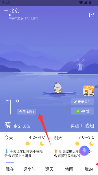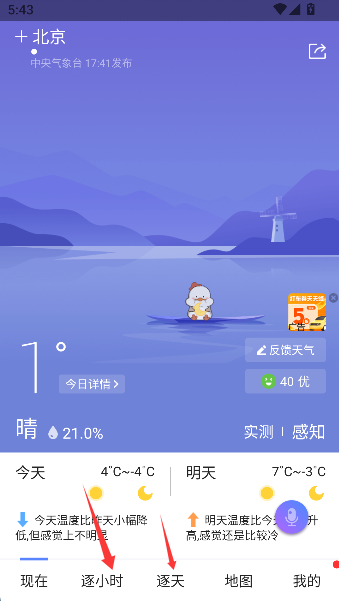 3、 按需求点击逐小时和逐天查看,就像打开了天气的预告片花絮,从下一秒的雨滴到未来的阳光,尽在掌握。