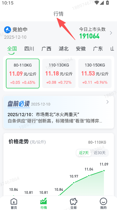 2、支持行情查询功能,进入行情页,查看不同体重段的生猪价格及近期价格走势。