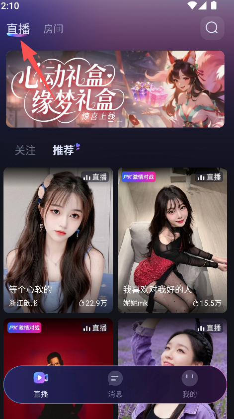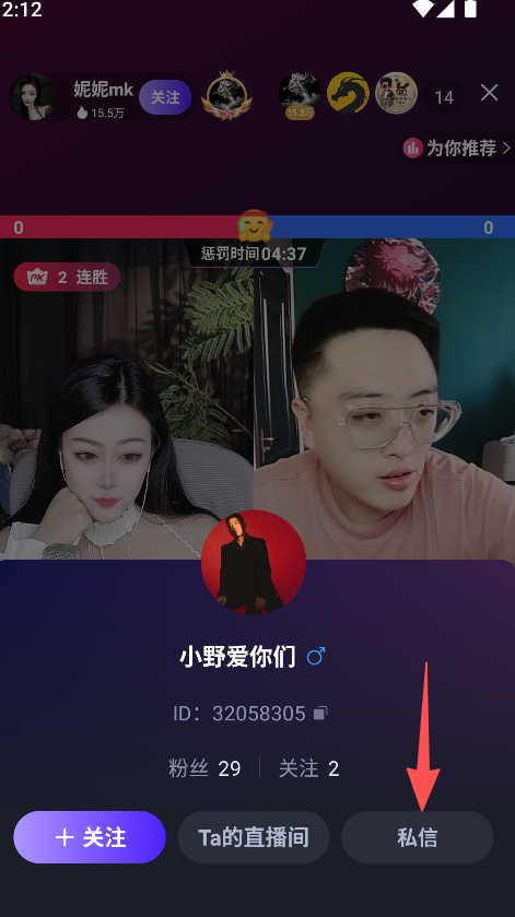 2、直播板块有推荐内容,直播间支持PK互动,配套用户私信功能,适配直播社交的实际互动需求。
