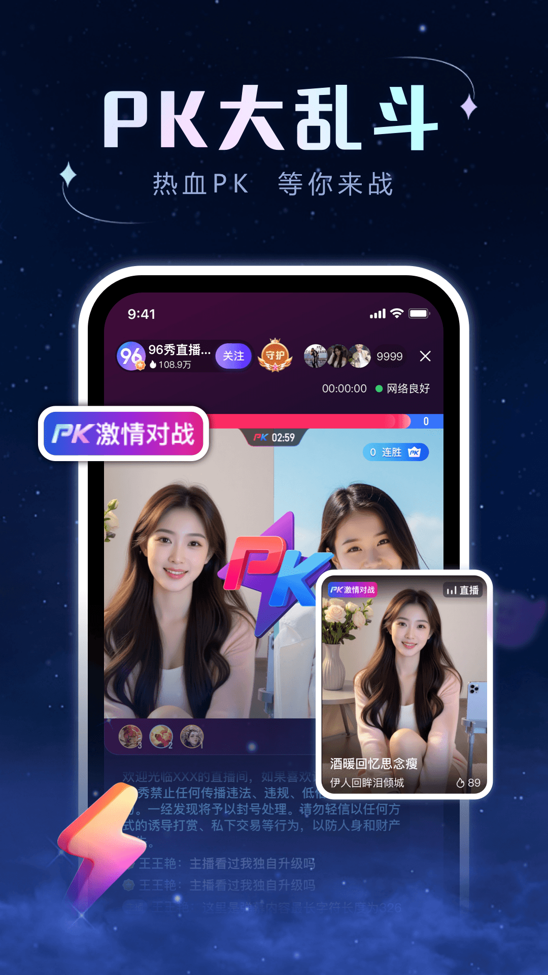 《96秀》是一款直播社交类软件,设直播、消息等板块,首页展示推荐直播间,进入直播间可观看内容及PK互动,还能发送评论、与用户私信交流,功能覆盖直播观看与社交互动场景,满足直播参与及社交连接的需求。
