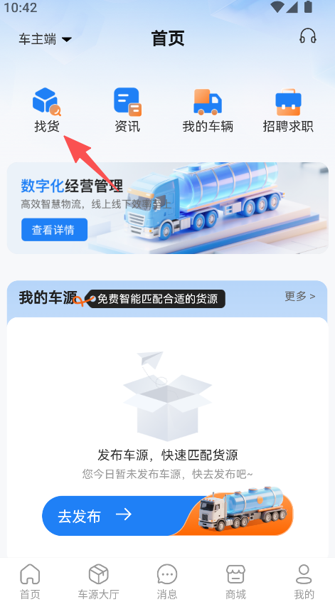 1、聚焦危货物流车主场景,功能涵盖找货、车源发布等,精准匹配危货物流的货源与车源管理需求。