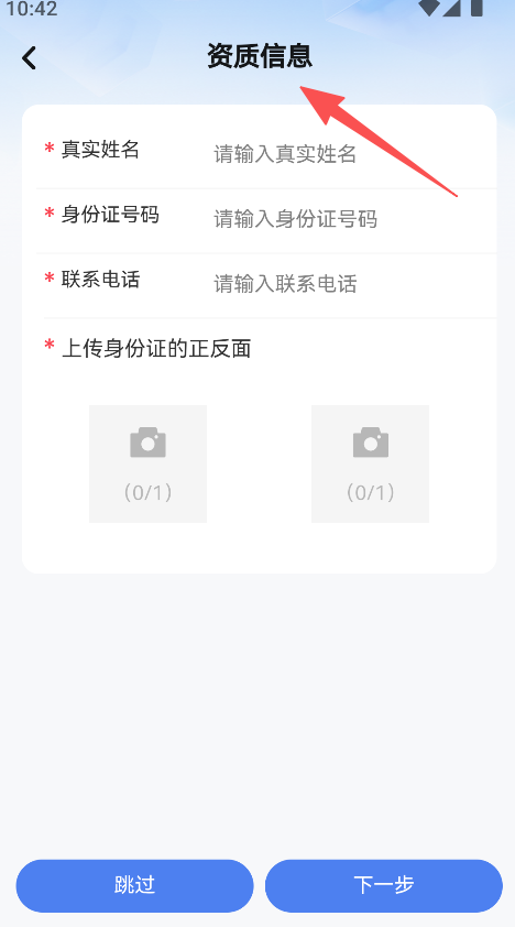 2、支持资质信息填写功能,在相关页面,可输入真实姓名等信息并上传身份证材料。