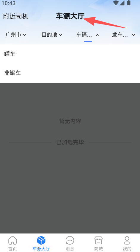 3、实现车源大厅查看功能,进入车源大厅页面,可浏览罐车、非罐车等对应的车源信息。