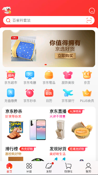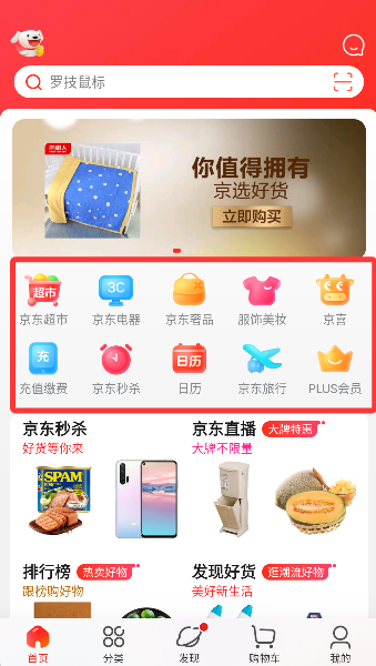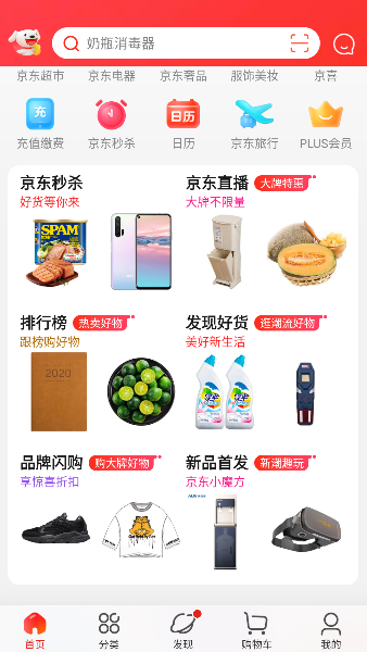 2、首页中间排开京东超市、日历和秒杀等板块,宛如一个热闹的迷你商业街,任你随意逛逛挑挑。