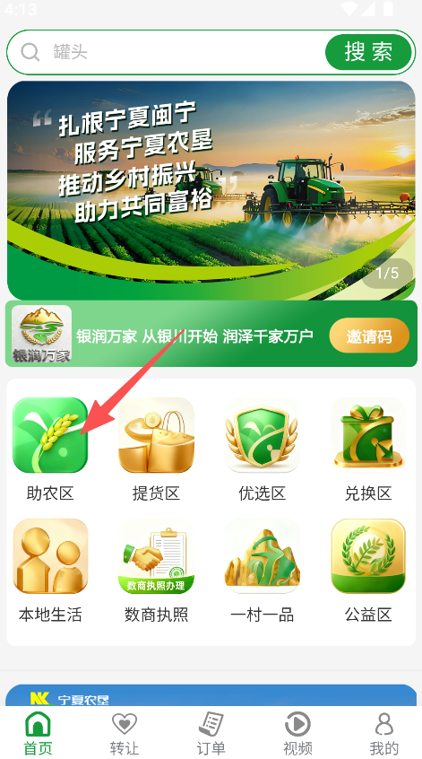1、进入首页,点击助农区板块查看展示的农产内容。