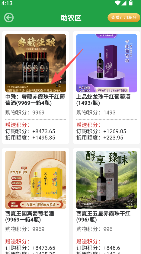 2、选择助农区内的商品,查看其购物积分及相关额度信息。