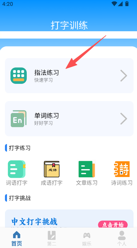 1、进入首页,选择指法练习或词语短语等打字练习类型。