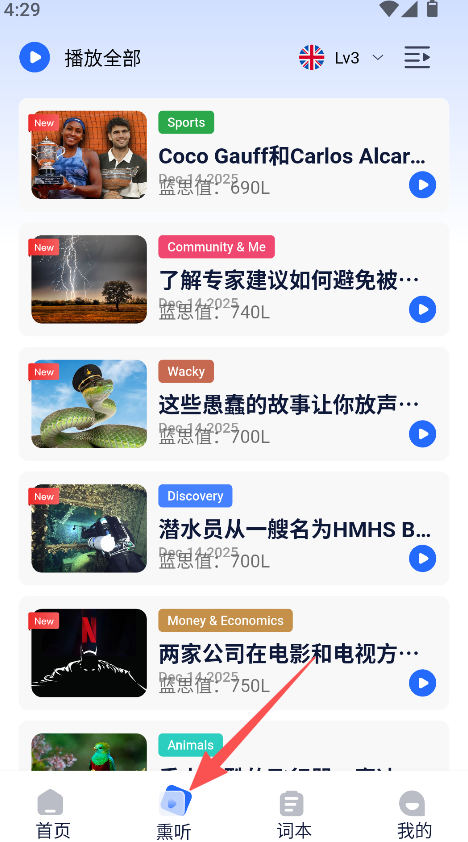 1、进入熏听板块,查看本期分类下的音频资讯内容。
