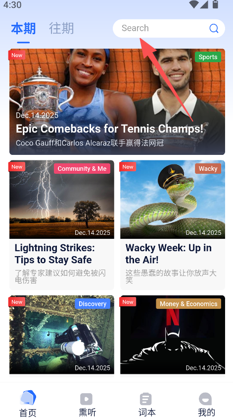 2、支持搜索操作,在搜索框输入关键词,查找对应的音频资讯内容,获取所需信息。