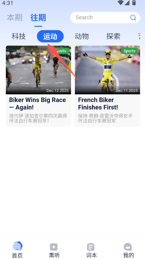 3、切换至往期分类,选择科技或运动等子分类浏览内容。
