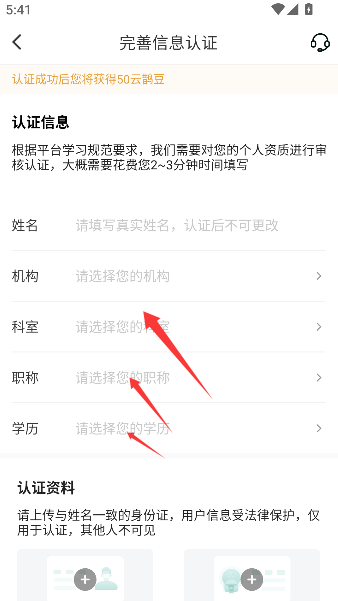 2、接着选择科室、填写职称和学历,仿佛在精心组装自己的“专业名片”,让平台更懂您的学习背景。