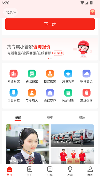 2、操作流程设计契合搬家事务的逻辑顺序,从询价到售后,功能路径线性清晰,指引明确。