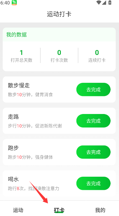 2、可在此查看历史累计打卡天数与总完成次数;页面中会列出预设的打卡任务。