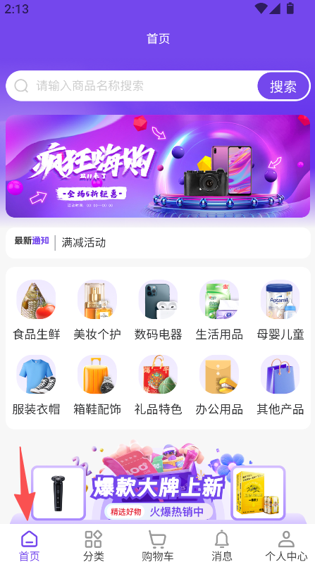 2、首页展示满减活动及商品分类,分类板块细化品类,完善购物的商品选择维度。