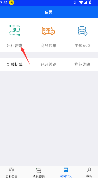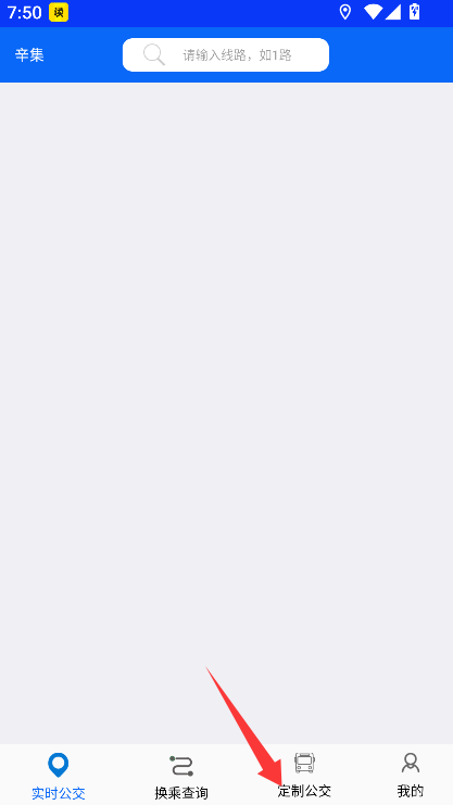 1、找到并点击位于功能区域或导航栏中的“定制公交”服务入口,点击后即可进入该特色服务的功能主页面。