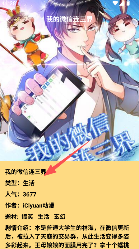 2、展示漫画的详细信息,包含类型、人气、作者、题材等内容,同时附带剧情介绍,便于了解作品内容。