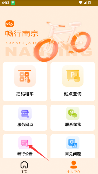 1、点击畅行公告,就像在梧桐成荫的城市路口掀开一块电子布告栏,各种骑行新闻与通知像鸽子般在此停驻。