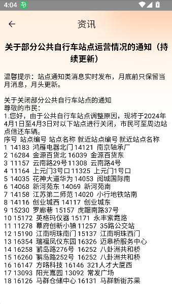3、滚动页面详细查看,仿佛徐徐展开一幅关于站点调整或活动详情的金陵骑行卷轴,所有细节在指尖滑动间缓缓呈现。