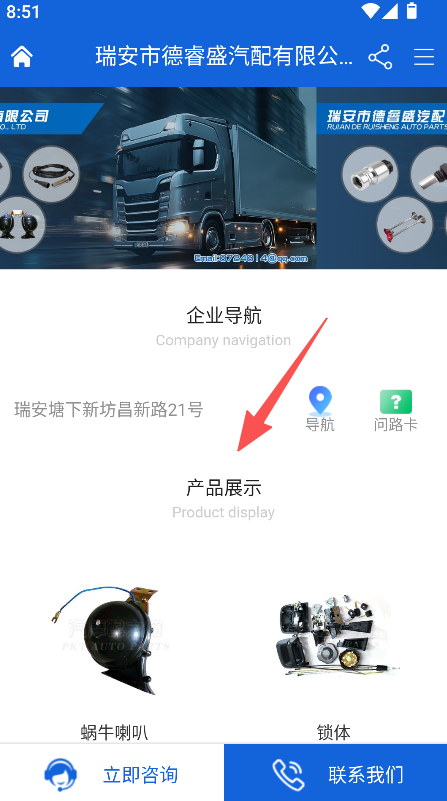 2、设企业导航、产品展示板块,呈现企业地址、产品信息等内容,提供汽摩配企业的多维度信息展示。