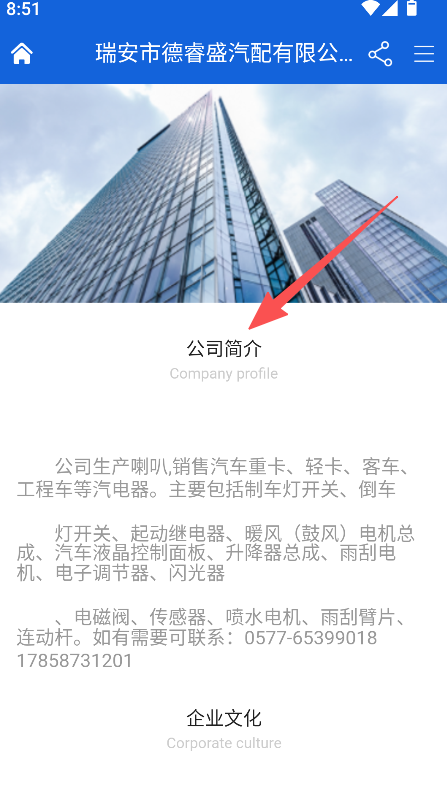 3、包含公司简介板块,展示企业业务范围、联系方式等内容,助力行业用户了解企业资源与业务布局。