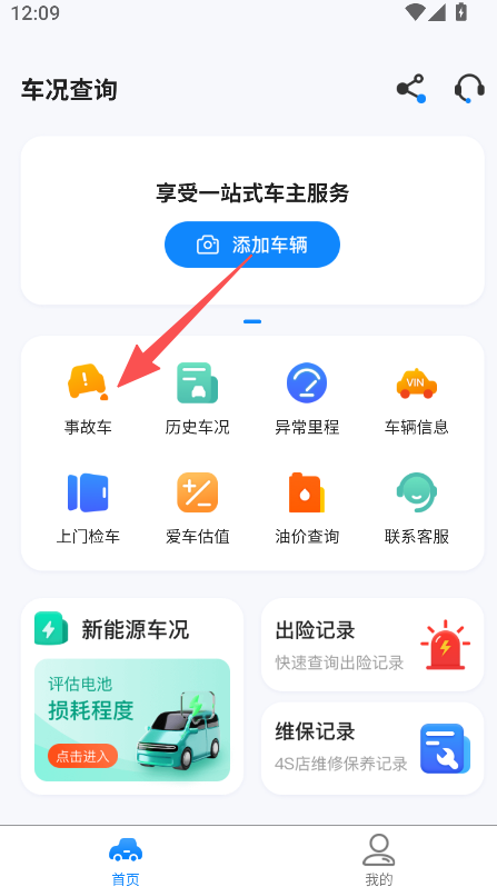 1、支持选择事故车、维保记录等查询选项,进入对应功能页面开展车况相关信息查询。