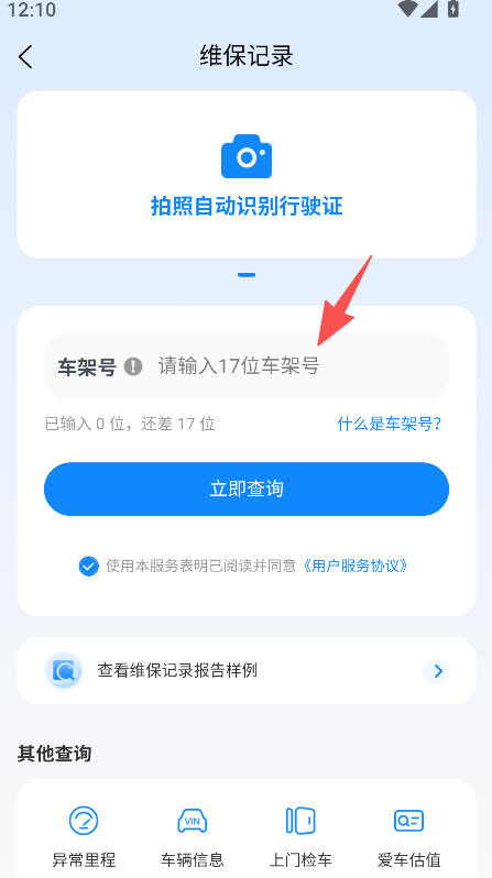 2、可在维保记录页面输入车架号,点击立即查询按钮,获取对应的车辆维保相关信息。