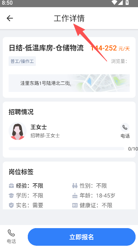 3、在工作详情页,查看信息后点击立即报名。