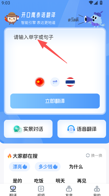 1、支持在输入框填写单字或句子,点击立即翻译按钮,获取对应的泰语或中文译文。