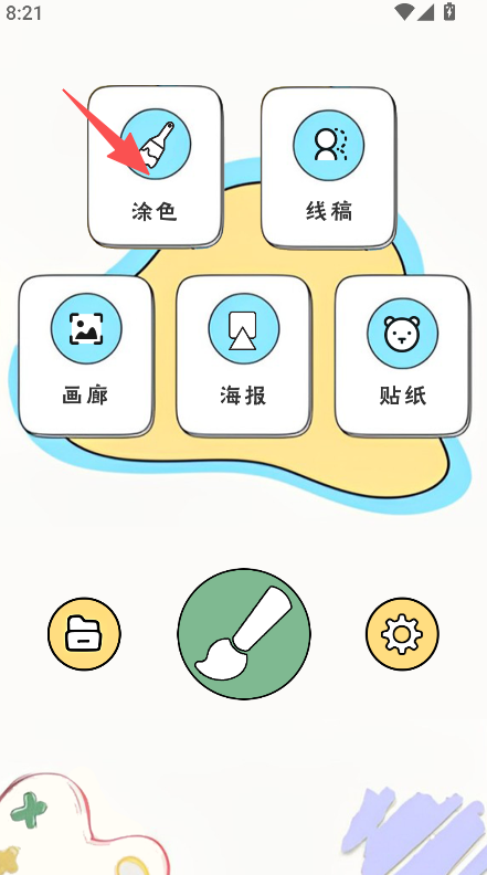 3、进入填色页面,选底部彩笔进行涂色创作。