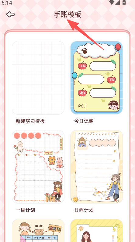 1、提供多种手账模板选择功能,进入模板页,选定今日记事等模板开展手账创作。
