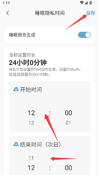 3、设置好开始与结束时间并保存,就像为你的睡眠划定了神圣不可侵犯的“数字宵禁”,世界终于清净了。
