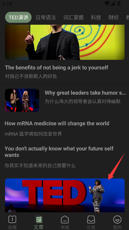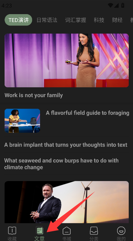 2、在“演讲”或“有声”分类中找到并点击希望收听的具体演讲标题。