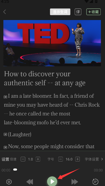 3、在此界面找到并点击显著的“播放”按钮,系统便会开始播放该演讲的音频内容。