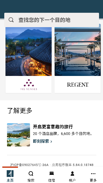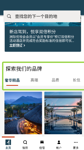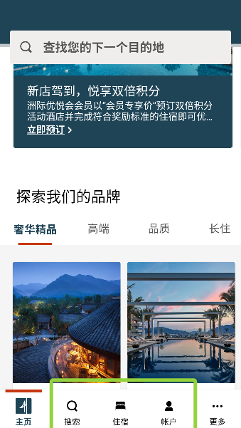 3、首页底部牢牢扎根搜索、住宿和帐户板块,恰似旅行三件宝:万能钥匙、行程地图与积分金库,布局清晰一目了然。