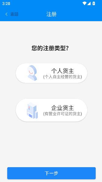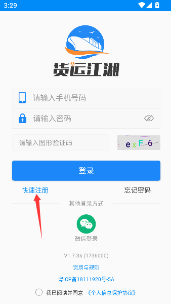 1、点击快速注册,犹如登上货运江湖的码头,即刻领取一张闯荡四方的船老大身份契。