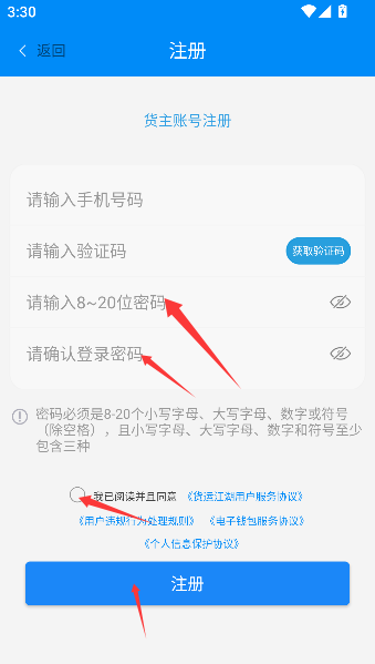 3、设置密码并勾选协议后点击注册,便是为你的虚拟货轮升起专属旗帜,正式鸣笛启航。