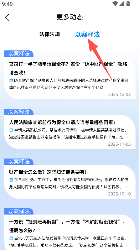 2、支持动态内容查看,点击更多进入更多动态页面,浏览以案释法的法律攻略内容。