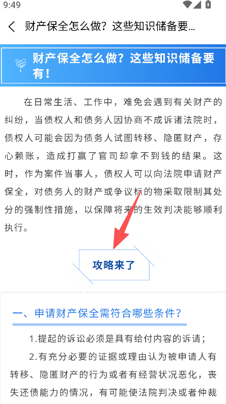 3、点击目标以案释法文章,查看财产保全等攻略信息。
