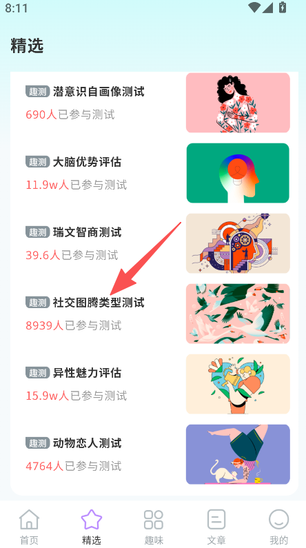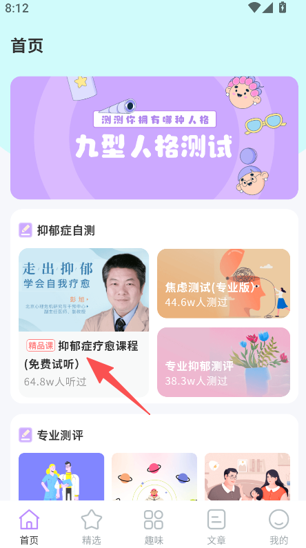3、功能板块清晰,精选趣味文章等板块区分明确,便于快速找到对应类型的自测内容,操作便捷。